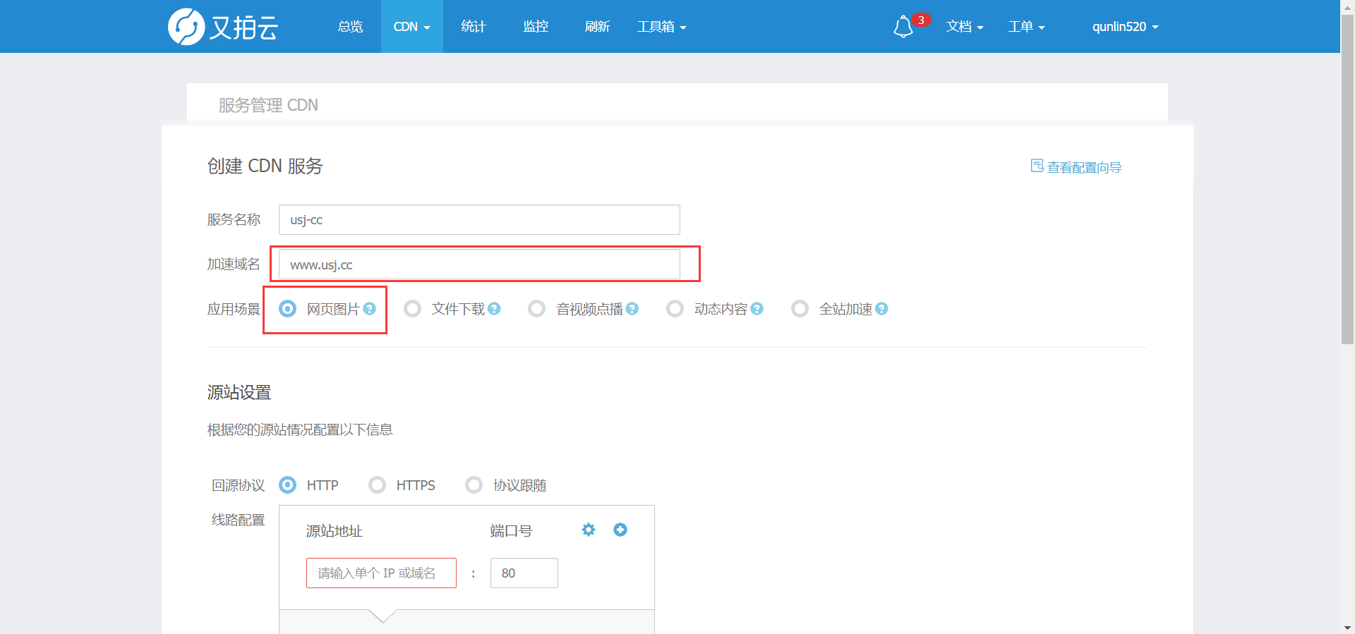 所以你直接按照我下面图片设置就好了,应用场景选择网页图片,填写好你的域名,如果你的主域名是usj.cc