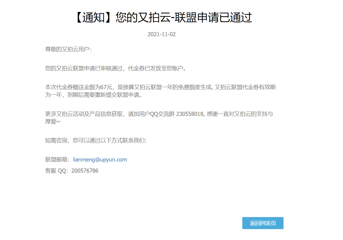 然后提交申请加入又拍云联盟即可,审核小姐姐真的很给力,基本上两个小时就给你通过申请了