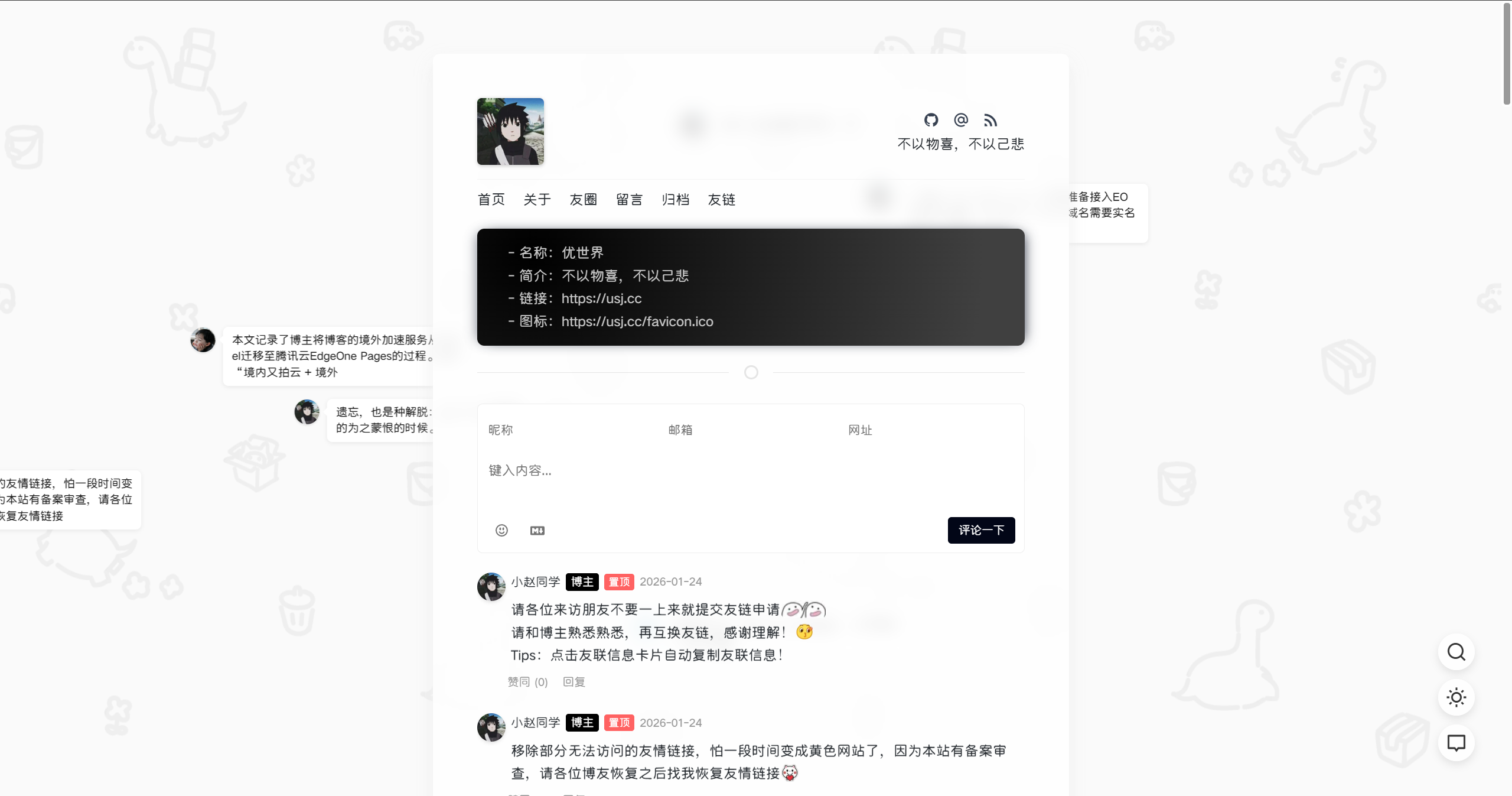 这周末不用加班,人闲下来了,打开电脑,chorme浏览器键入 usj.cc ,简单看了一下博客的样式,有几处我还不是很满意。